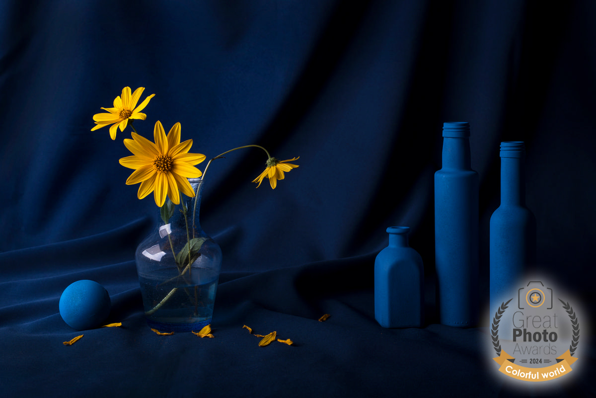 «…This photo belongs to two of my thematic sections, «marguerites» and «yellow-blue». It was created and set up from scratch by attributing special importance to composition, color and lighting.