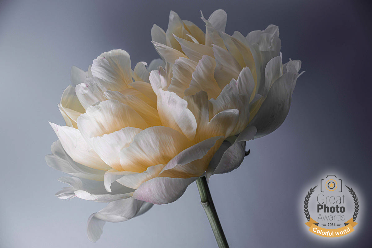 «…An intimate, close up portrait of a fully bloomed peony flower.Lighting was carefully placed to highlight shapes and textures of each petal…»
