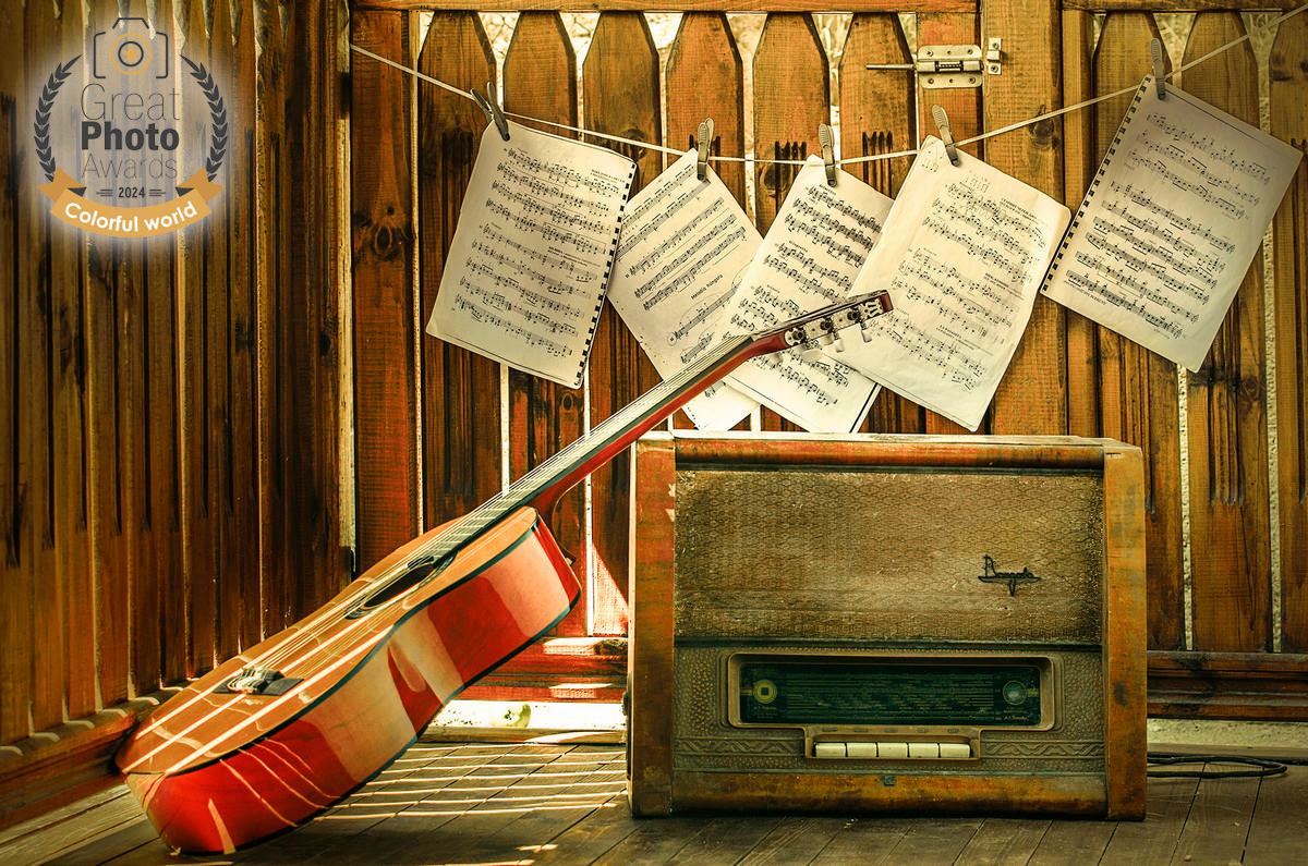 «…I found the old radio on a rooftop of a house. There was also an old music schoolbook. I found them really beautiful and I decided to make a still life using them and my son’s guitar. Used the natural lightning on the wooden terrace of the house…»