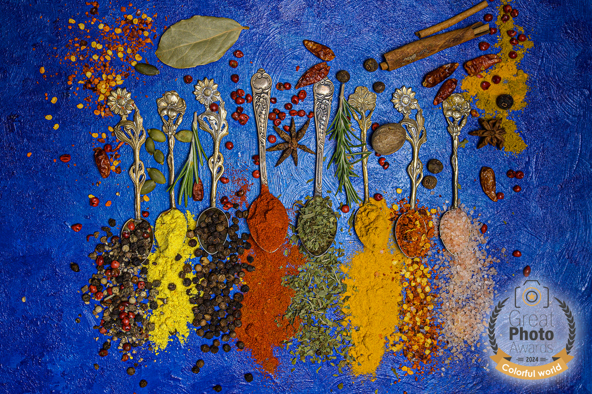 «…Memories and forms: the silver family spoons overflow with abundant spices and colors, placed in a row on the blue of harmony and freedom, in a dialogue of colorful bliss.