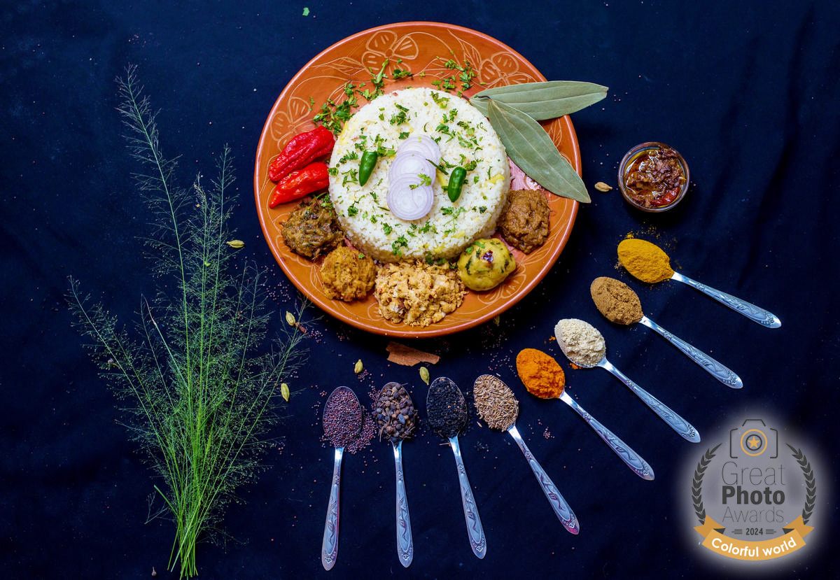 «…Every nation has its own culture and food habits.Bangladeshi food culture is enriched with various kinds of spices. Any kind of appetizing food in Βangladesh is made with spices which improve the taste properly. This is a photo of traditional Bangladesh food, too, known as «Boua vat» in villages and it’s served with various types of delicious mash. And it looks really so colorful…»