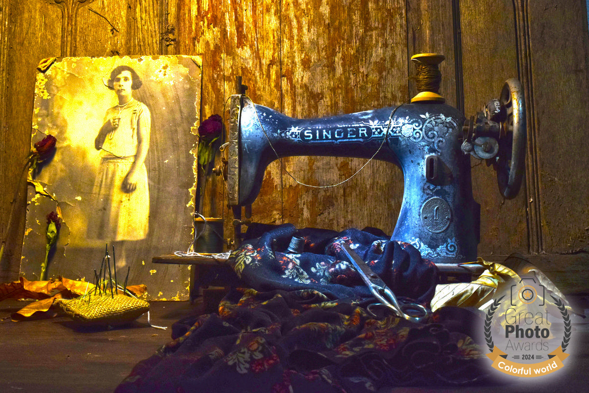 This photo is a tribute to my grandmother. She used this Singer sewing machine to support her daughters after being widowed at a young age in 1932. I still have it, along with the last dress she was sewing before passing away in 1966, as a humble tribute to her strength….»